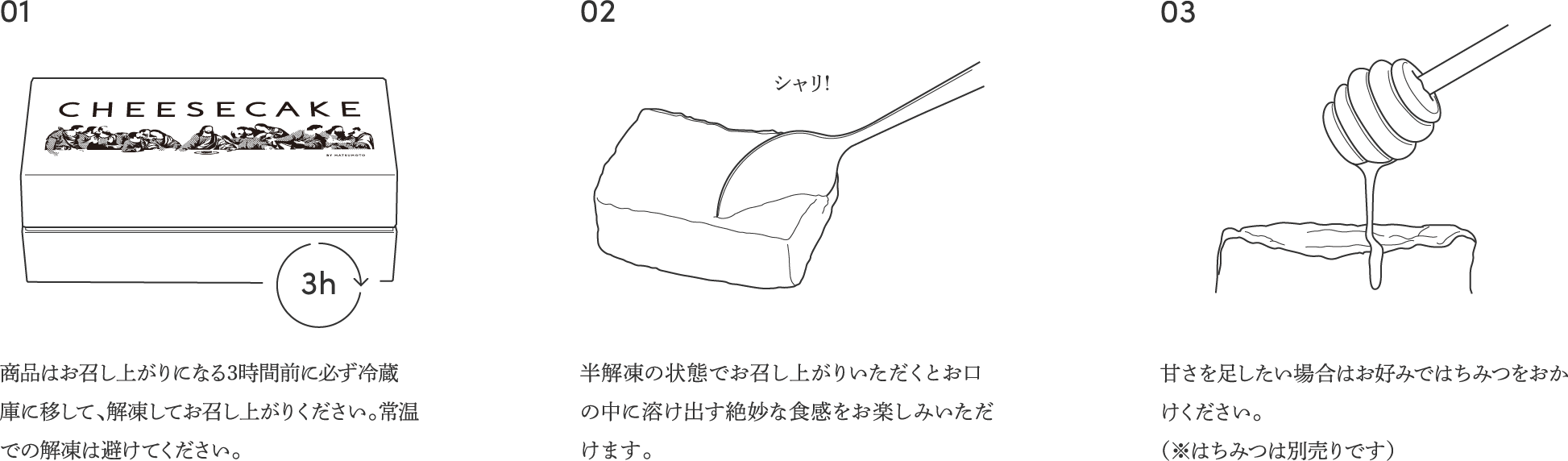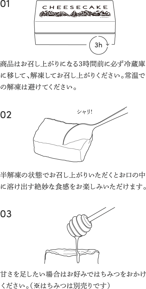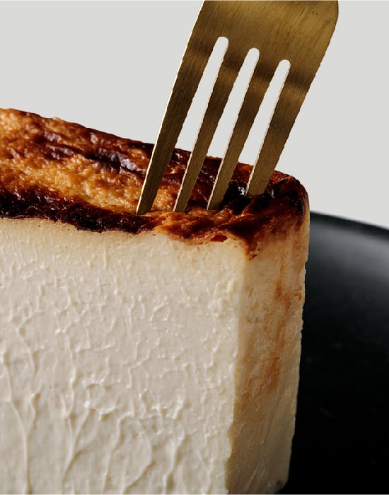 当店のチーズケーキはグルテンフリーなだけではなく、お砂糖を一切使用していないバスクチーズテリーヌです。“甘すぎない自然の甘味”を至高の贅沢として、お砂糖の代わりに、鳥取県産のクリームチーズや生クリームとの相性を追及したこだわりの百花蜜をふんだんに使用しました。罪悪感のない口溶けをぜひ、お楽しみください。
